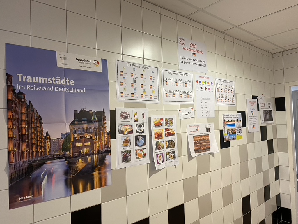 Les élèves germanistes de 5ème bilangue et de 5ème LV2 ont réalisé des affiches en allemand avec le nom d’une matière. Puis ils les ont accrochés sur les portes des salles selon la matière enseignée dans cette salle.